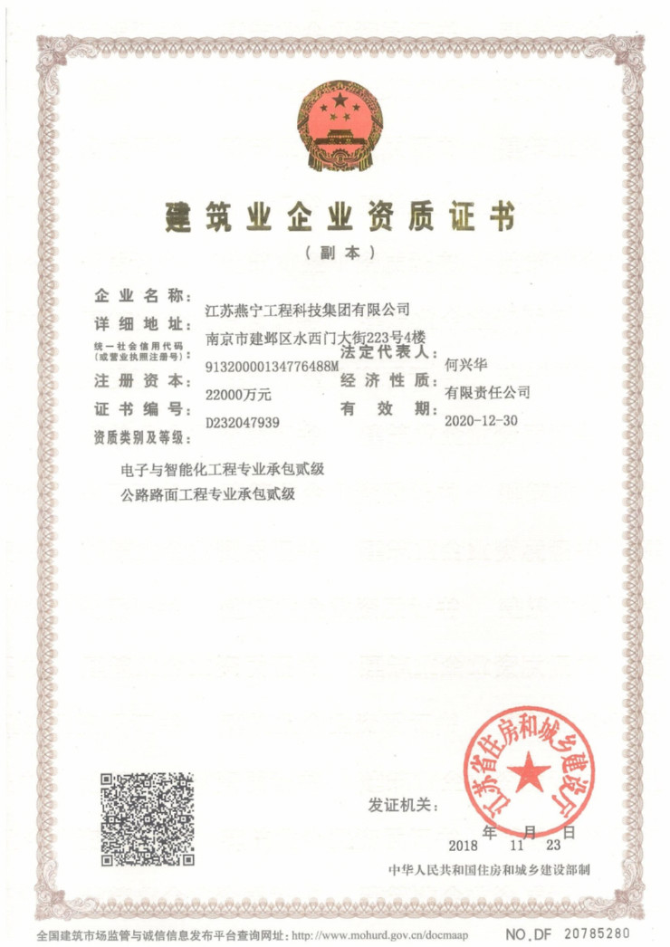 This is another qualification acquired by Yearning Engineering in 2018 in addition to the Surveying and Mapping Qualification Certificate (Grade B). The acquisition of this qualification further improves the market competitiveness in the field of electronic intelligence, and provides new support to the industrial transformation of Yearning Engineering.