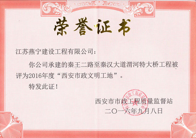Xi'an Qinwang second bridge project by Jiangsu Yearning Engineering Technology Group Co., Ltd. won the title of "Xi'an municipal civilized site" in 2016.